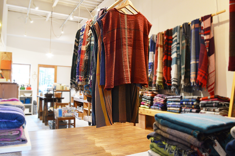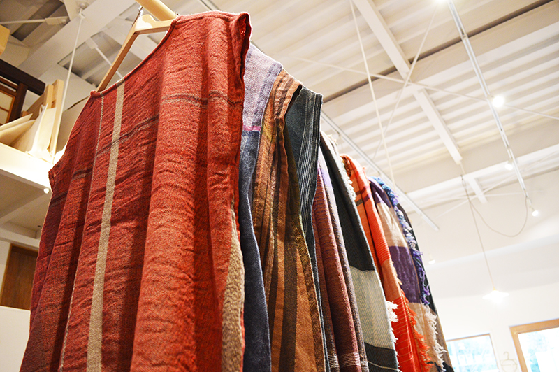 福井県出身のデザイナー 玉木新雌/tamaki niimeが糸を染め、ビンテージの織機で手間と時間をかけて、ふんわりと柔らかく織り上げたショールが、彩り鮮やかに並びます。