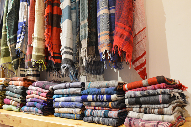 色にあふれ、年齢も性別も選ばない、だれでも自由に楽しめるショールを手に取って、その柔らかさを体感してください。
